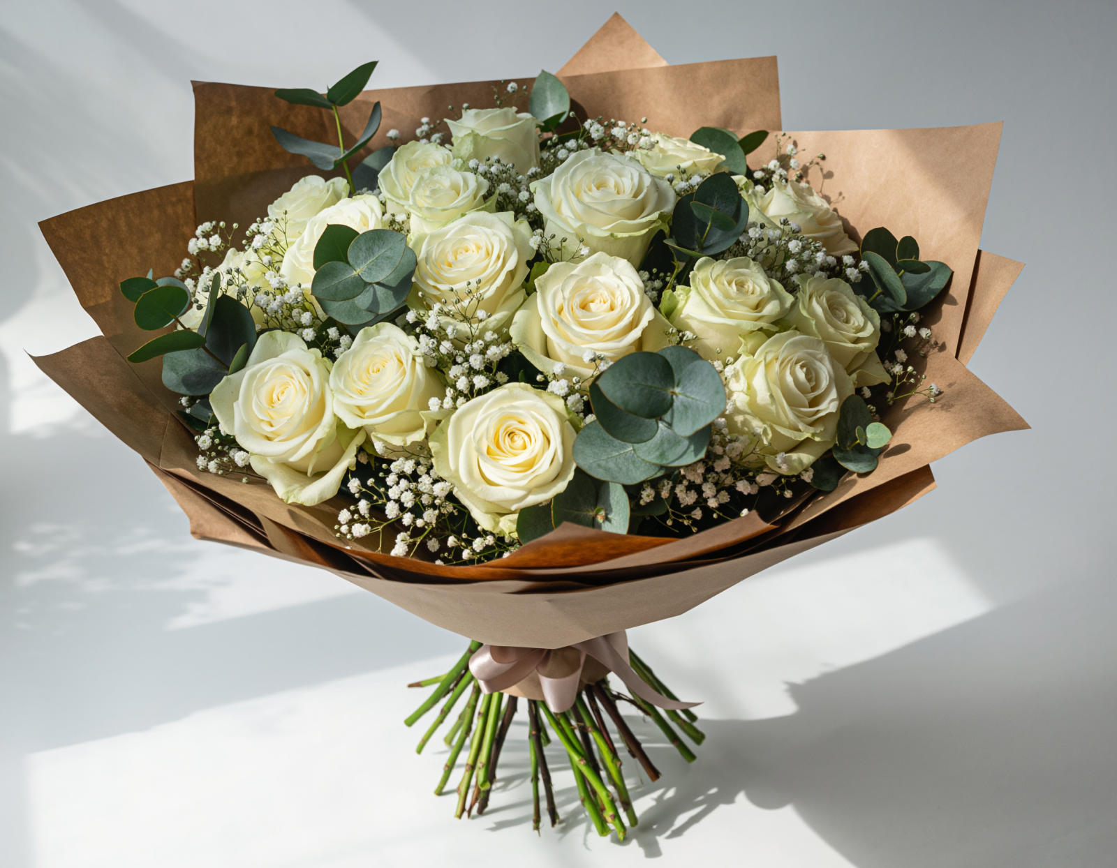 Buchetul este completat cu gypsophila și eucalipt, alese pentru a evidenția delicatețea trandafirilor albi și pentru a oferi un aspect luminos și armonios. Ambalarea și elementele decorative pot varia în funcție de stocul disponibil, fiecare buchet fiind realizat individual, cu atenție la detalii.