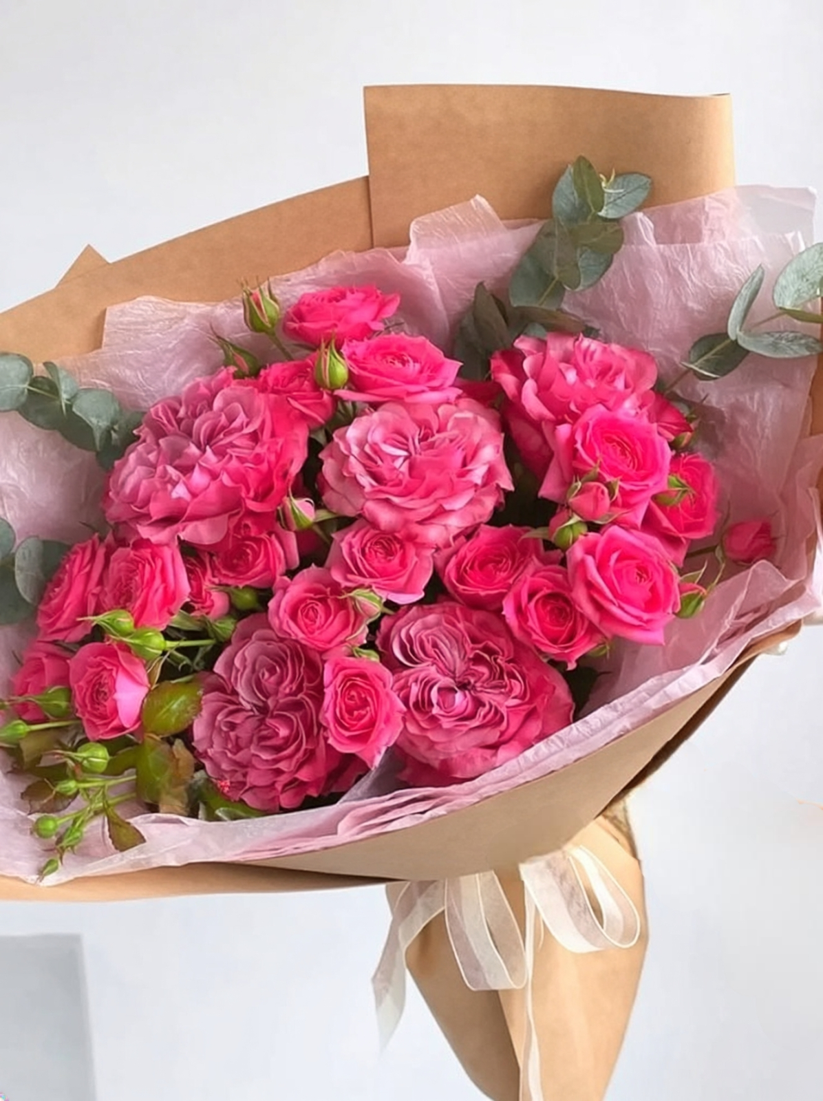 Nuanțele de roz oferă buchetului un aer romantic și feminin, iar combinația dintre trandafirii clasici și mini trandafirii adaugă volum, textură și un aspect vizual plin de finețe. Este alegerea ideală pentru gesturi romantice, surprize delicate sau momente speciale petrecute în doi.
