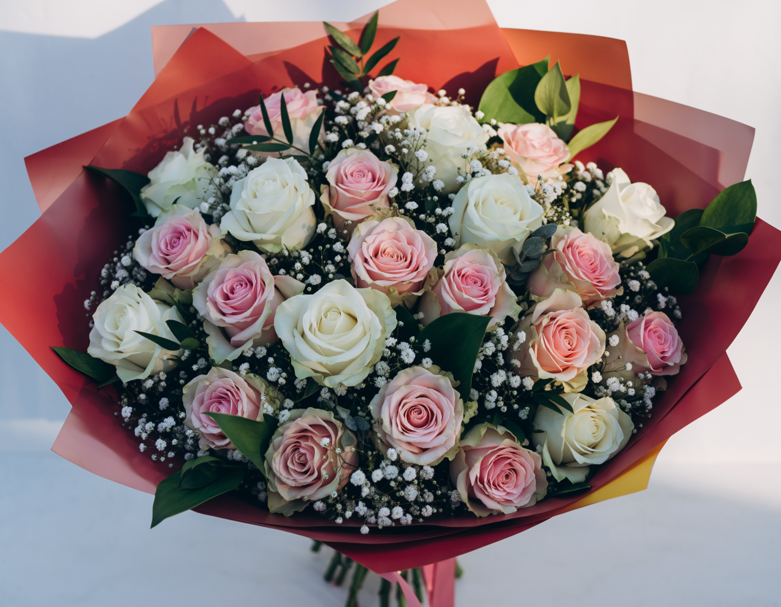 Candy Blush este un buchet romantic realizat din 39 de trandafiri în nuanțe de alb și roz, completat cu gypsophila și verdeață ornamentală pentru un efect aerisit și delicat. Combinația de tonuri pastel oferă un aspect luminos și elegant, evidențiind textura florilor și volumul compoziției.